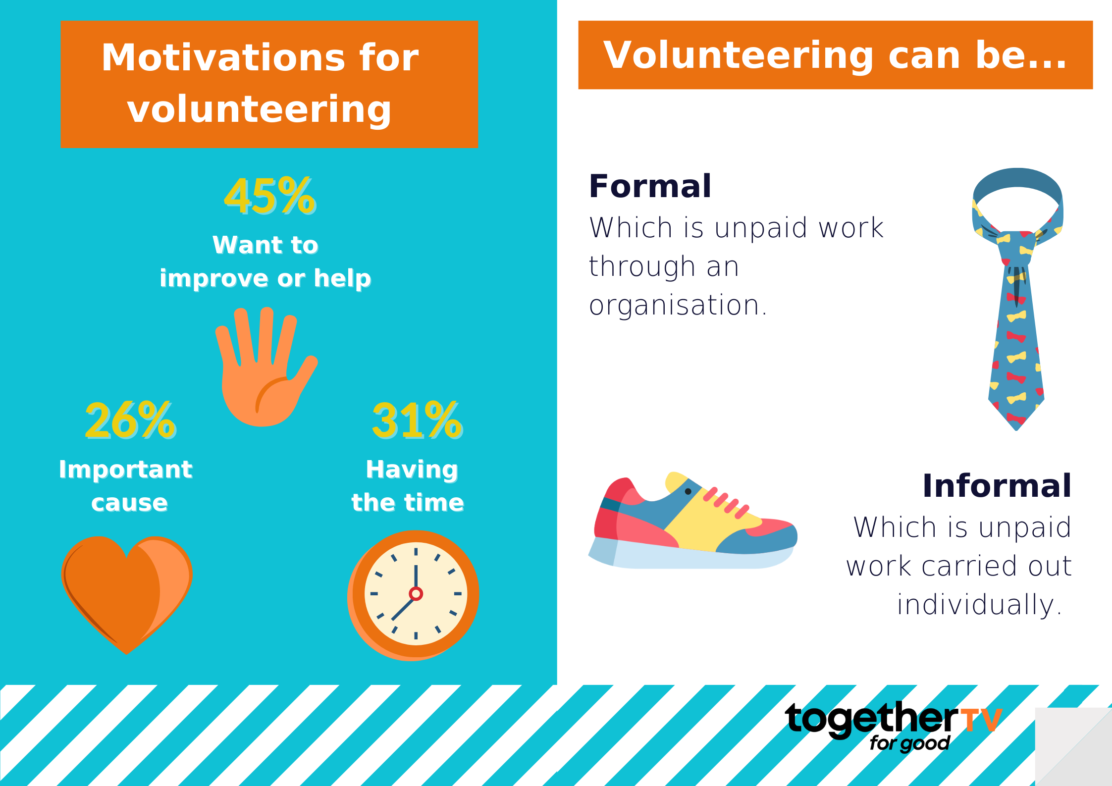 The most common motivation for people to volunteer is wanting to improve things or help people (45%). Other reasons include the cause being important to them (31%) and having spare time (26%).