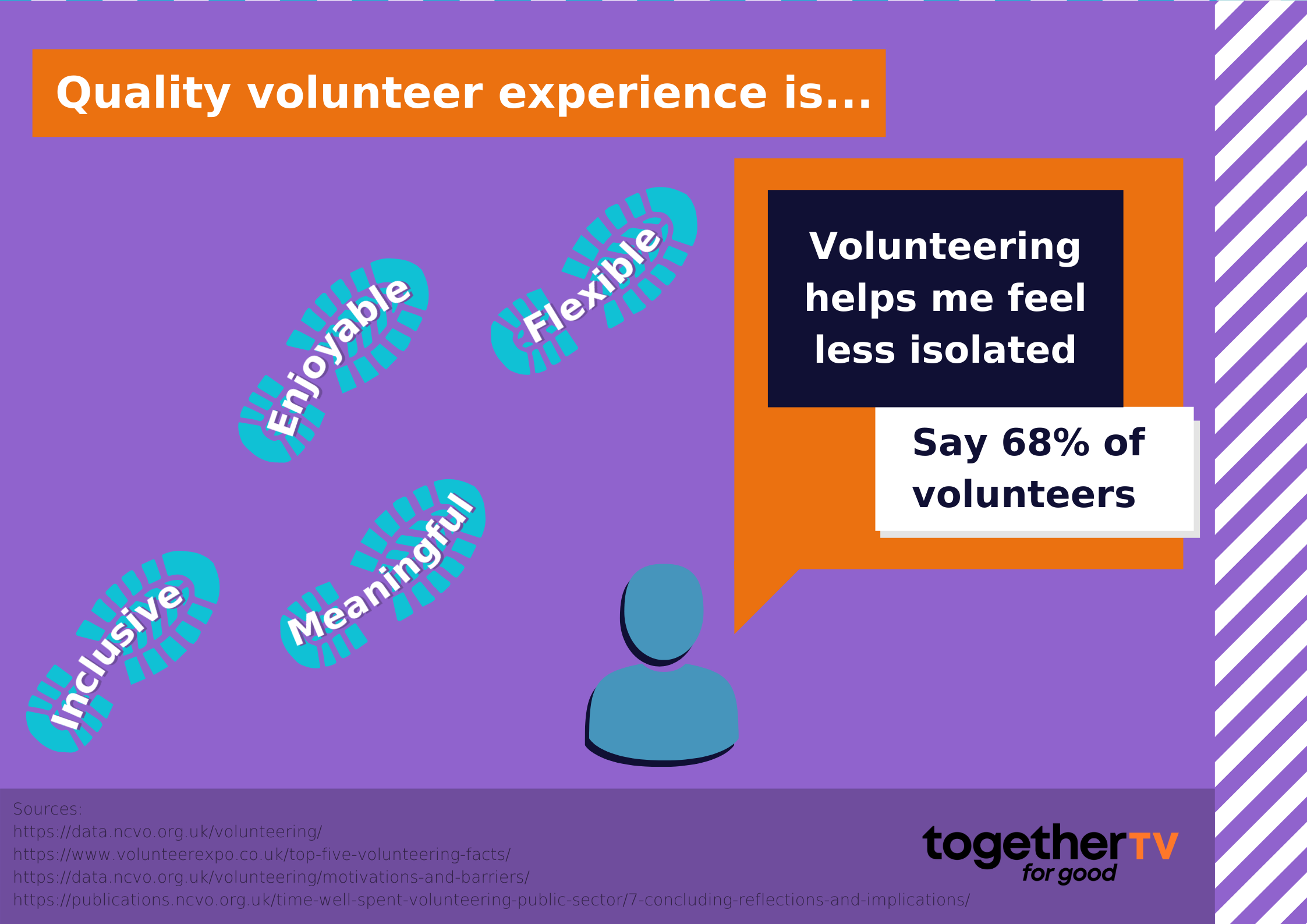 A quality volunteer experience is inclusive, meaningful, enjoyable, flexible among other things. In addition, over two thirds of volunteers (68%) say volunteering helps them feel less isolated.