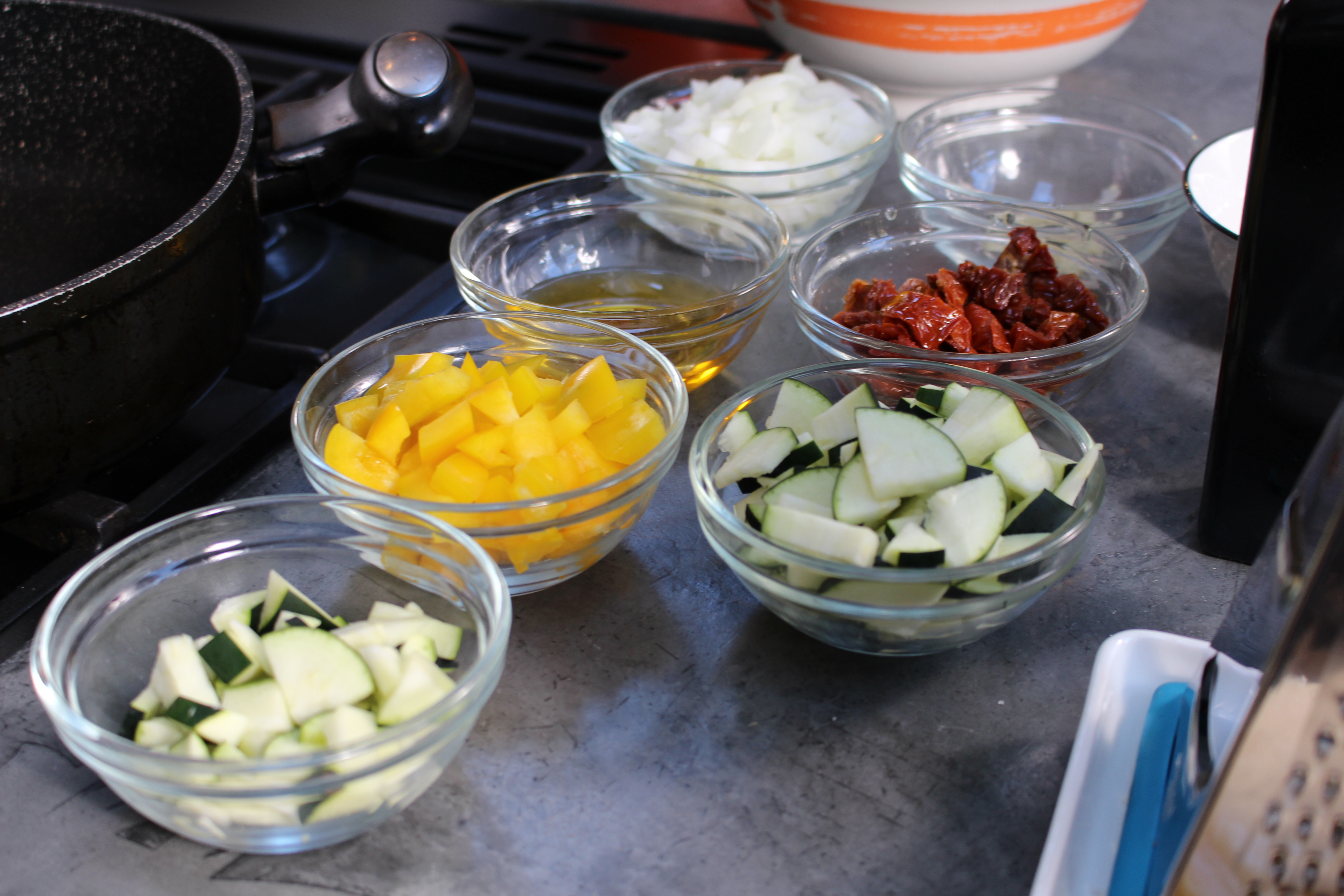 Fry the onion and garlic using the oil from the sundried tomatoes for 5 minutes in a deep frying-pan or saucepan.