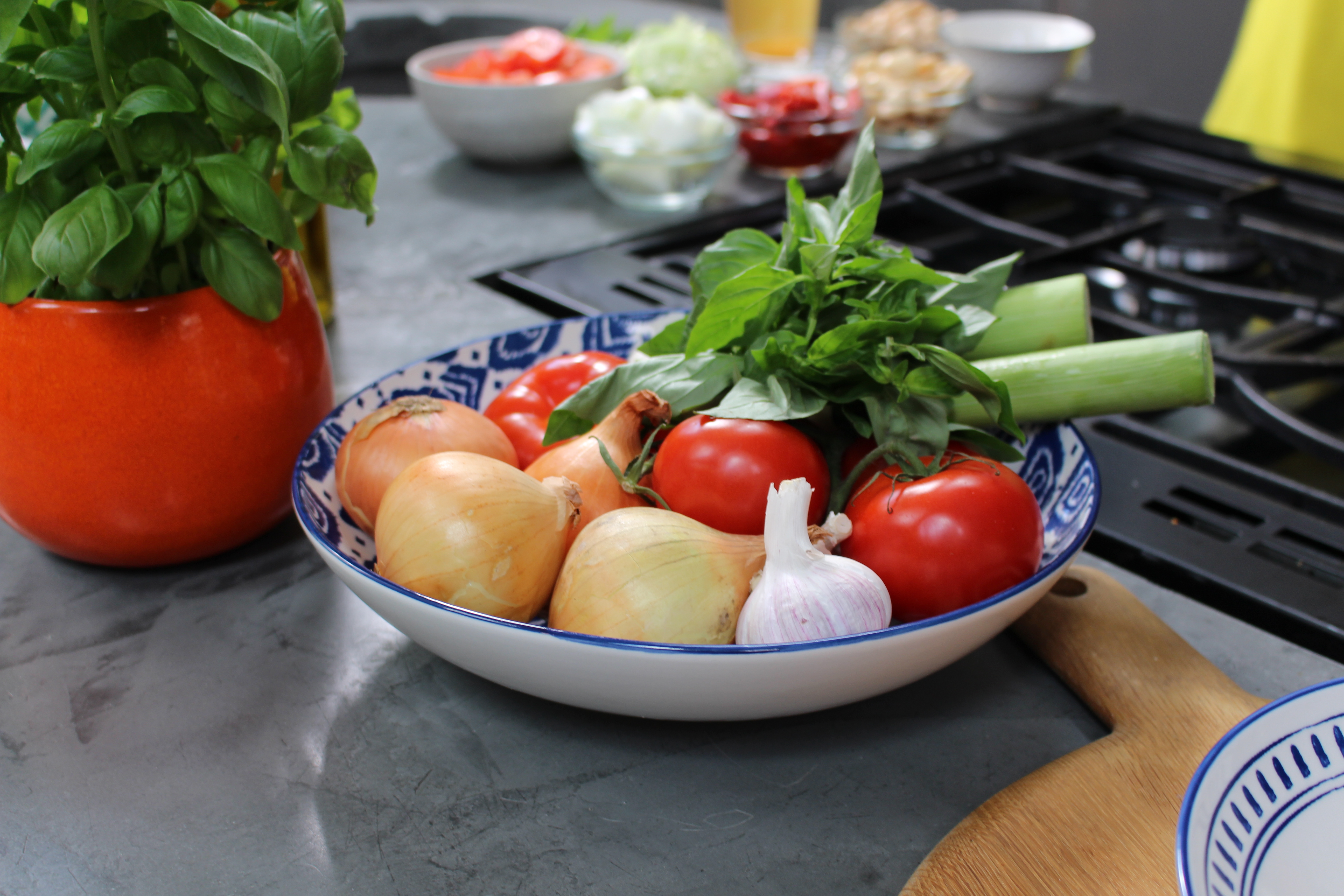 Tomatoes are acidic so balancing with sweet carrot and salty veg stock helps equalise those levels. Rustie uses veg stock, salt and pepper to season her soup, but be sure to taste the soup before you serve so you can balance it to your own palate: