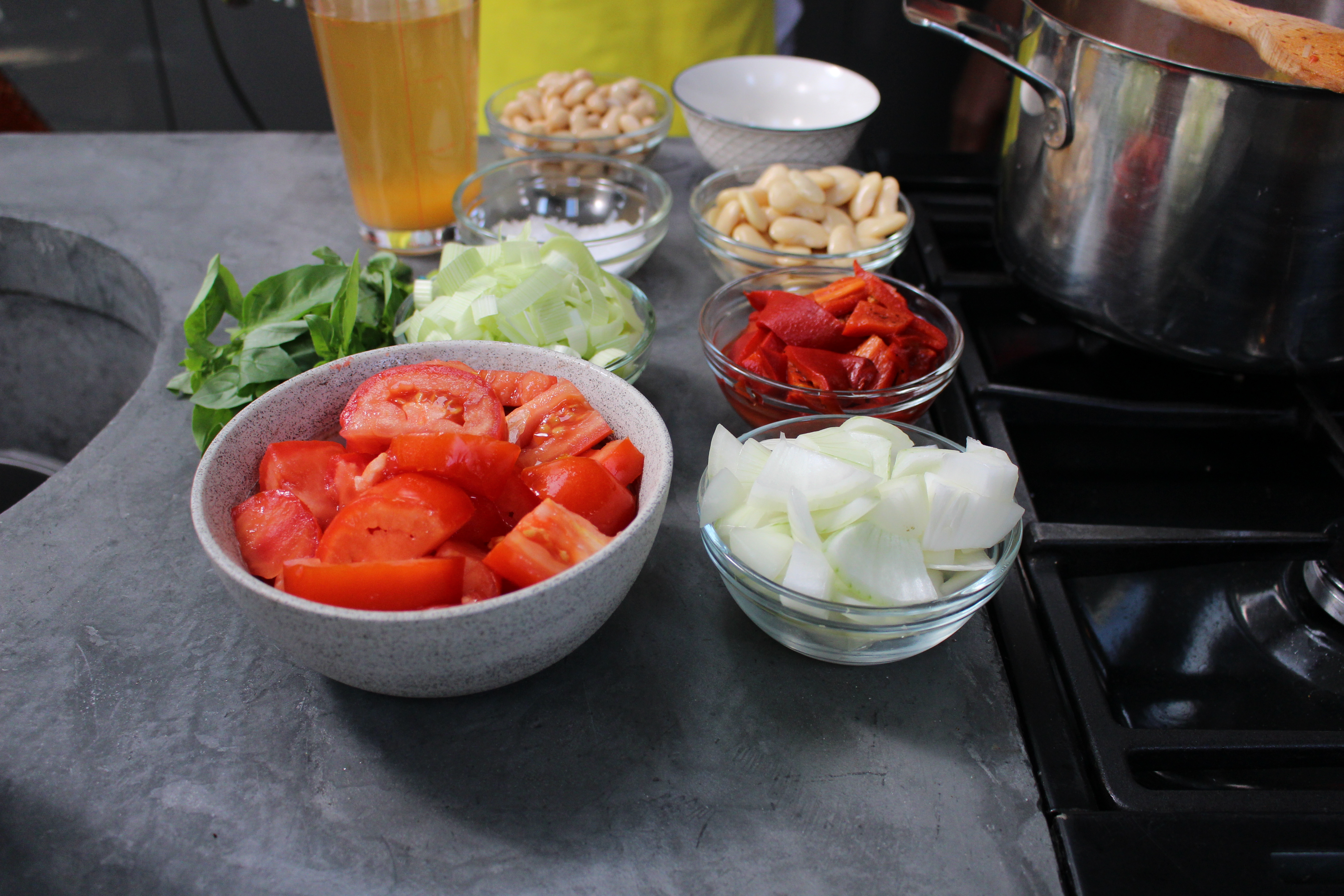 Chop the onion and leeks, then fry in a big saucepan for 3 minutes on a low-medium heat. Add remaining ingredients except cannellini beans and basil. Simmer for 15 minutes.