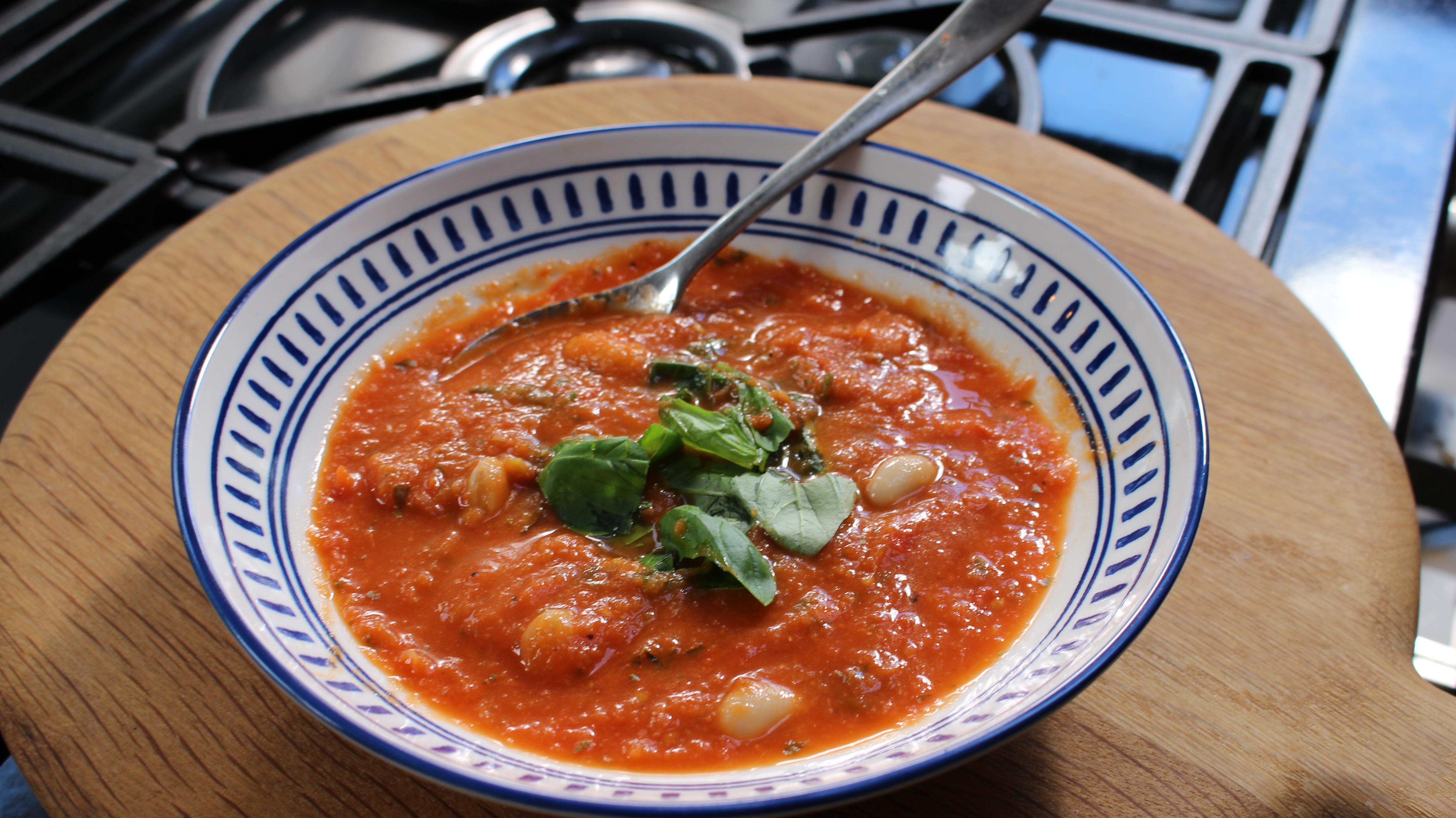 Take off the heat and add the basil. Use a hand blender or pour the soup into a food processor to blitz at high speed.