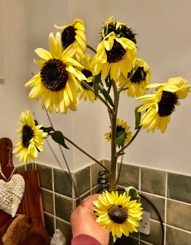 The sunflower stem broke so I wanted to do something different and I love making my own wreaths (I’m not a professional.) I had a wreath frame from earlier in the year, probably a Christmas one as I recycle them. The wreath are ones like the above photo, but you probably could find one from many places. To attach the flowers to the frame, I just pushed the stem through the frame and tied it down at the back to secure it. I use garden twine and string just to tie the stems of the sunflower to the wreath at the back. Whatever you have to hand. I used my Christmas wreath holder to hang on my door.